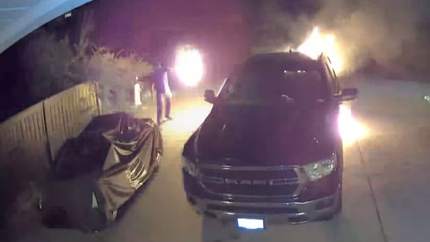In this video, security cameras capture a man alleged to be Vikram Sharma as he pours gasoline on two vehicles parked at Punjabi singer AP Dhillon’s house in September 2024 before setting the cars on fire. Sharma’s co-accused Abjeet Kingra is then seen stepping forward and firing 14 rounds into Dhillon’s Colwood, B.C., house. Sharma has since fled to India. Kingra is serving a six-year sentence.