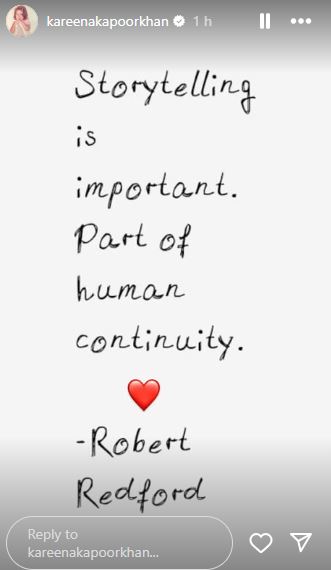 Mourning his loss, actor Kareena Kapoor shared a quote from Redford on her Instagram story. She wrote, ‘Storytelling is important. Part of human continuity’ – Robert Redford.”