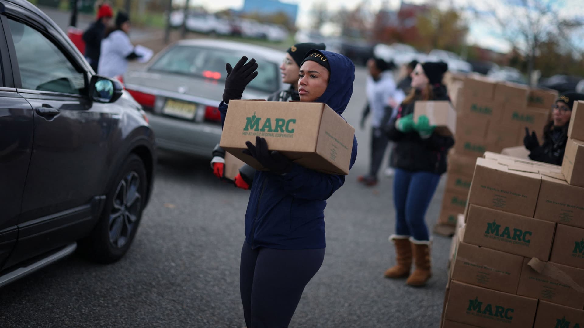 Volunteers load boxes of food into cars during an event held by the Community FoodBank of New Jersey in partnership with Bergen County to deliver emergency food relief to Federal workers and SNAP recipients amid the U.S. government shutdown in Leonia, New Jersey, U.S., November 6, 2025.
