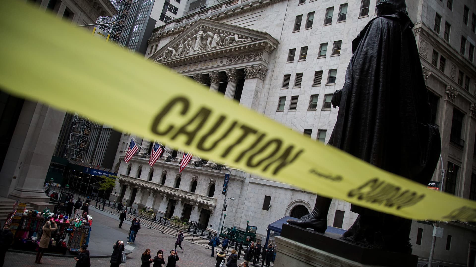 Caution tape hangs near the steps of Federal Hall across from the New York Stock Exchange in New York.