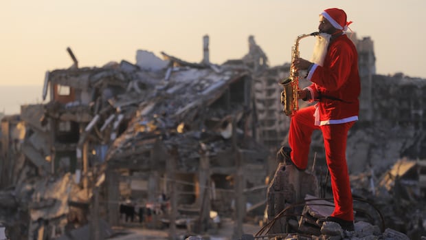 Izzat Al-Qawasmeh and his 11-year-old son Mohamed dressed as Santa and visited an encampment in Gaza City, where Al-Qawasmeh played saxophone while walking through the ruins of what were once apartment buildings.