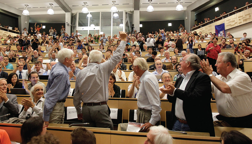 The Higgs boson discovery dominated headlines around the globe. About half a million people tuned in to watch the livestreamed announcement, and footage from the event appeared on more than 5,000 news programs. Even oddball minutiae made it into the press, with a few articles analyzing the physicists’ use of the often-scorned font Comic Sans in their presentation. Little more than a year later, the discovery garnered a Nobel Prize for two of the scientists who developed the theory behind the Higgs boson, François Englert and Peter Higgs — for whom the particle is named.