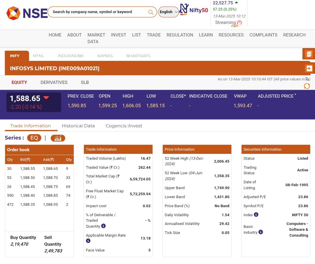 Stocks of Infosys Limited (NSE: INFY) opened in red today, March 13, during the early morning trade. According to the National Stock Exchange (NSE) website, shares of Infosys Limited (NSE: INFY) were trading at INR 1,588.65 and dropped by INR 2.20, or 0.14%. On Thursday morning, the Sensex was up 233.39 points or 0.32% at 74,263.15, and the Nifty was up 60.10 points or 0.27% at 22,530.60. MTNL Share Price Today, March 13: Stocks of Mahanagar Telephone Nigam Limited Rise by 15.31% in Early Trade, Check Latest Price on NSE.