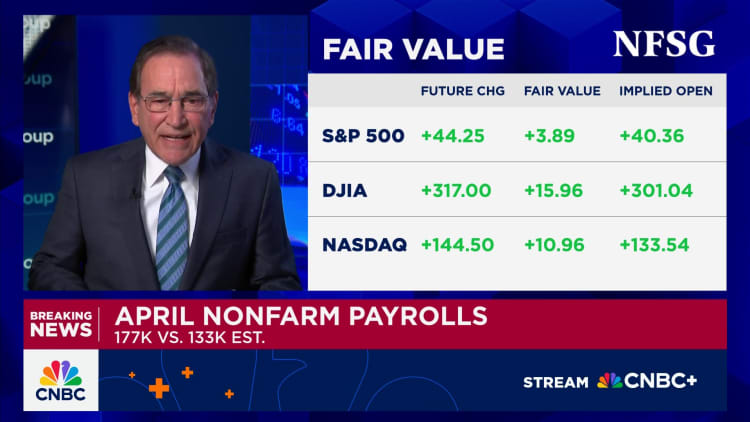 Nonfarm payrolls increased a seasonally adjusted 177,000 for the month, slightly below the downwardly revised 185,000 in March but above the Dow Jones estimate for 133,000, the Bureau of Labor Statistics reported Friday.