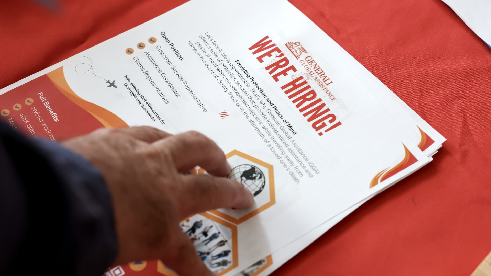 An attendee holds an “Entry Level Jobs” flyer at a City Career Fair hiring event in Sacramento, California, on Feb. 27, 2025.