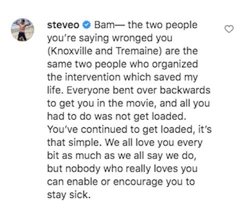 “Everyone bent over backwards to get you in the movie, and all you had to do was not get loaded,” Steve-O added. “You’ve continued to get loaded, it’s that simple. We all love you every bit as much as we all say we do, but nobody who really loves you can enable or encourage you to stay sick.”