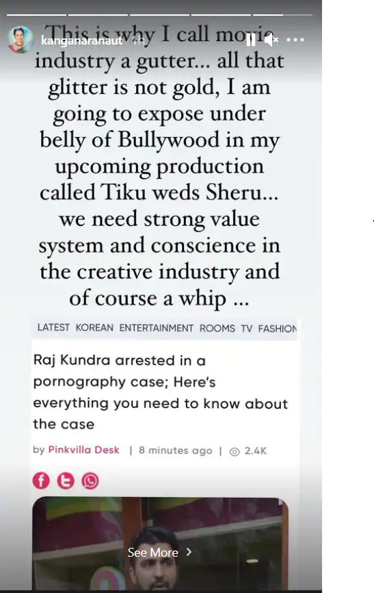 Kangana shared a screenshot of an entertainment portal with Raj Kundra news and wrote: This is why I call movie industry a gutter… all that