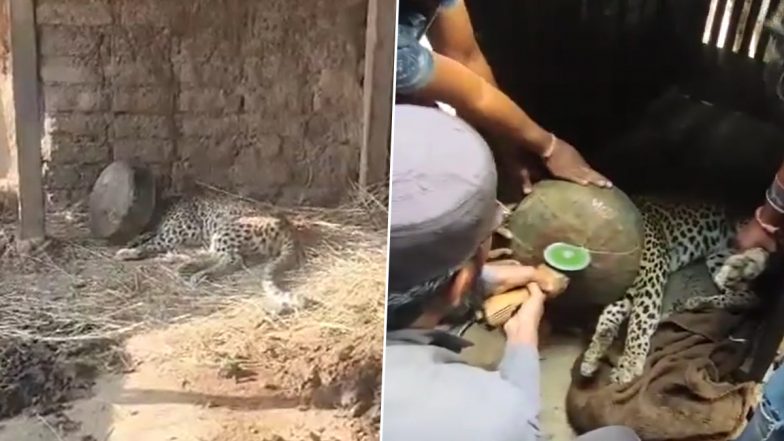 Maharashtra: Leopard Spends Five Hours With Head Stuck in Metal Pot in Dhule District, Rescued by Forest Officials (Watch Video)
