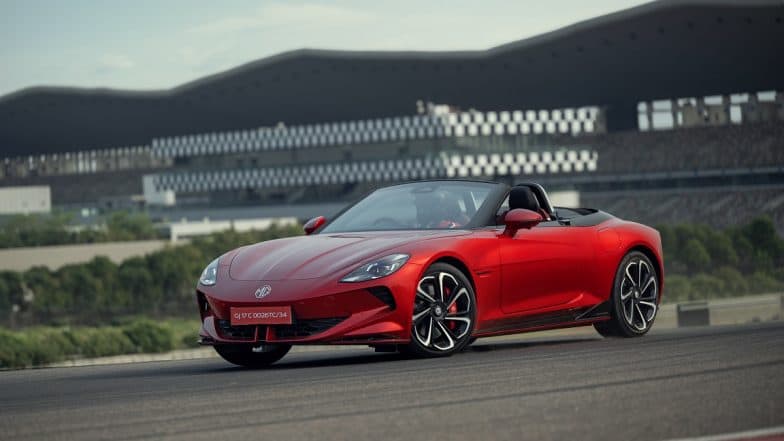 New Delhi, July 25: MG Cyberster electric roadster has been launched in India with a dual-motor setup and offers nearly 600 km range on a single charge. JSW MG Motor India introduced its MG Cyberster at a starting price of INR 74,99,800 lakh (ex-showroom). The cost of this new car from the British automotive marque is for the fresh bookings only. The customers can get this two-door electric convertible sports car at INR 72.49 lakh (ex-showroom) if they pre-reserve it.