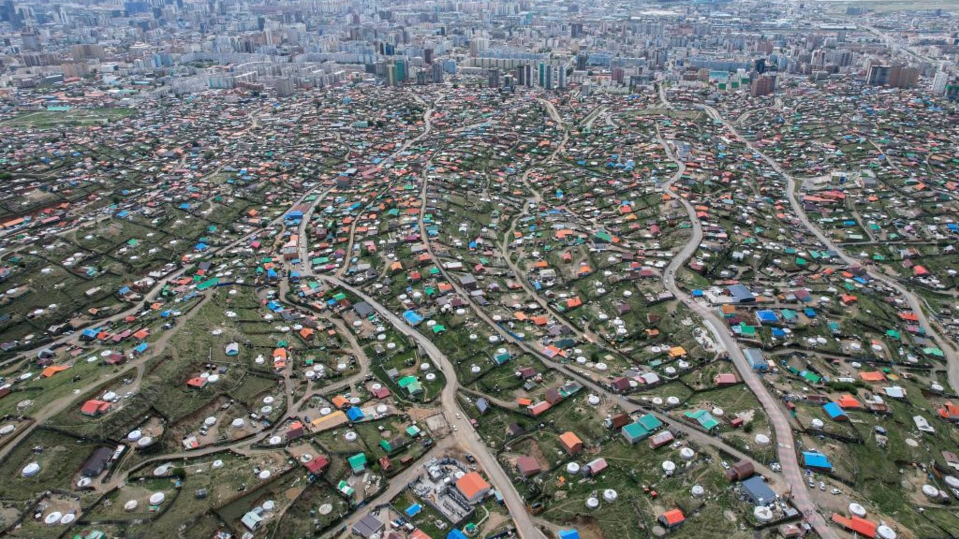 TOPSHOT – A general aerial view shows houses and Yurts in Ulaanbaatar, Mongolia on June 25, 2024.