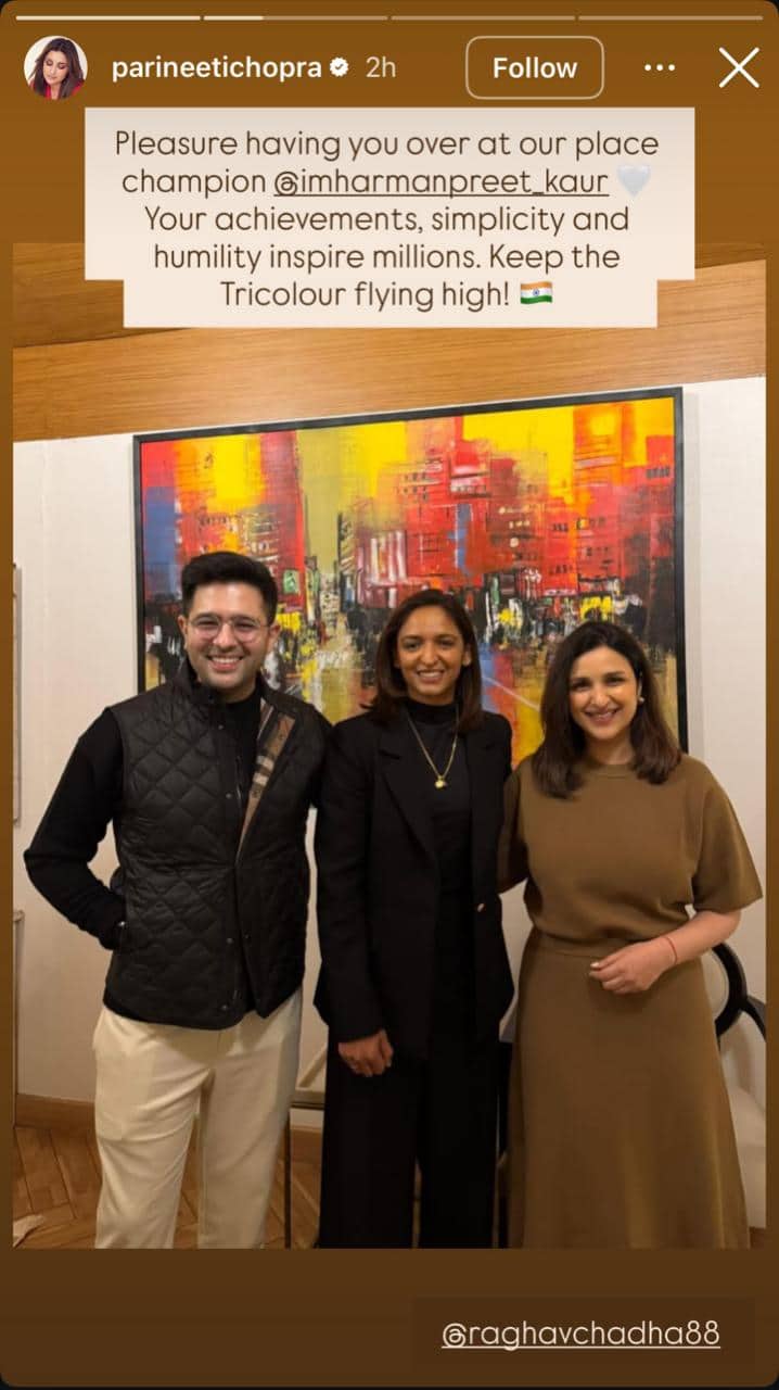 Delighted to have Harmanpreet at their place, Parineeti uploaded a pic of her and Raghav posing with the cricketer on the Stories section of her Instagram.
