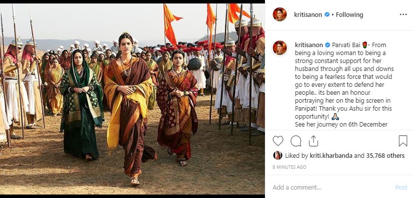 Thanking the man who gave her this opportunity — Ashutosh Gowariker, she went to extend a word of thanks to the film’s director writing: “It’s been an honour portraying her on the big screen in Panipat! Thank you Ashu sir for this opportunity!”