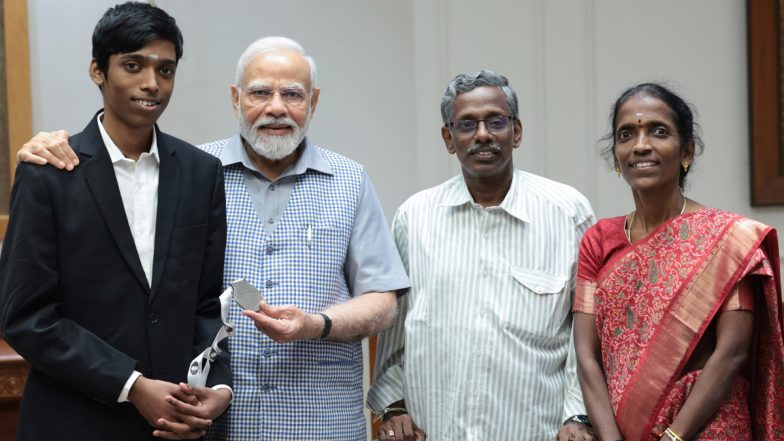 New Delhi, August 31: Prime Minister Narendra Modi on Thursday met chess prodigy R Praggnanandhaa, who recently made history by clinching the silver medal in the FIDE World Cup. “Had very special visitors at 7, LKM today. Delighted to meet you, @rpragchess along with your family. You personify passion and perseverance. Your example shows how India’s youth can conquer any domain. Proud of you,” Modi said on X after meeting him and his parents. PM Narendra Modi Lauds Chess Prodigy R Praggnanandhaa for ‘Remarkable Performance’ in FIDE World Cup 2023.