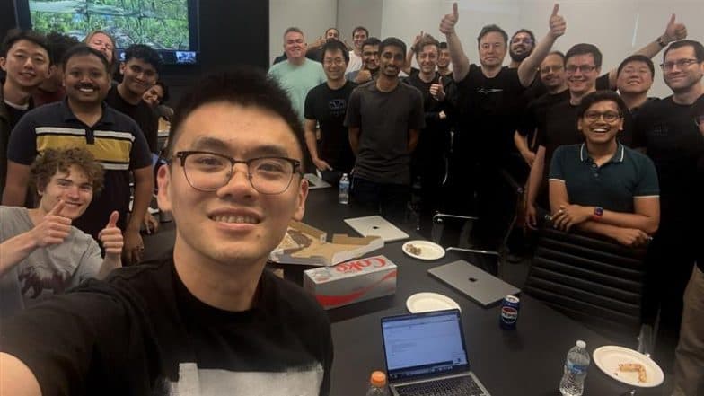 Tesla has started to offer its Robotaxi services in the US. Elon Musk joined the Robotaxi launch party with the Tesla AI team as the company rolled out its self-driving car service in Austin, Texas. Tesla CEO Elon Musk shared a post on June 22, 2025 and said, “The Tesla Robotaxi launch begins in Austin this afternoon with customers paying a $4.20 flat fee!” Elon Musk further congratulated the Tesla AI software and chip design teams on the successful Robotaxi launch. He said, “Culmination of a decade of hard work. Both the AI chip and software teams were built from scratch within Tesla.” Robotaxi Launched: Elon Musk’s Tesla Launches Driverless Car Service in Austin for USD 4.20, Invited Users Share First Ride Experience (Watch Videos).