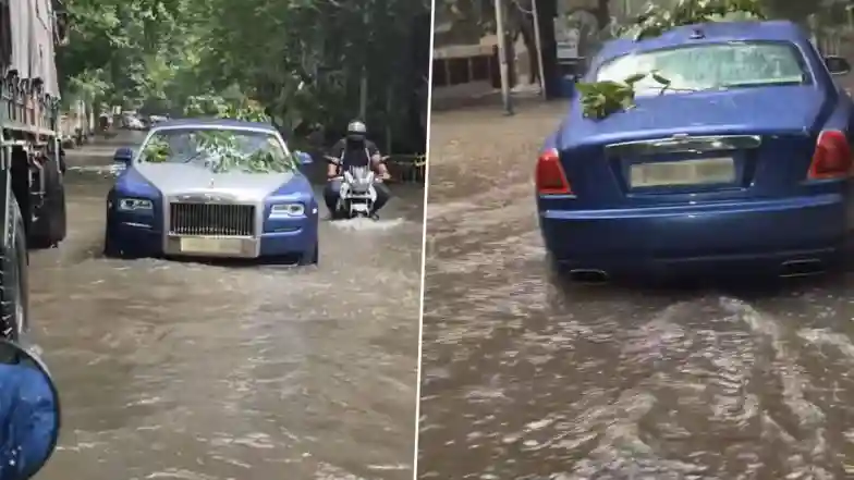 A video going viral on social media allegedly shows a Rolls-Royce Ghost Series II being stranded in the middle of a road in Kolkata amid heavy rains in West Bengal’s capital city. In the video, a blue and silver Rolls-Royce Ghost is standing still in the middle of a waterlogged street, with a few tree branches on top and other vehicles passing by it. The video was shared on Instagram with the caption reading, “When natural calamity makes you realise the age-old advice from our grandparents ‘Ja ache tai niye khushi thako’ (Be happy with what you have). Hoping everyone to be safe out there.” The viral clip shows the Rolls-Royce Ghost Series II being abandoned in the middle of a waterlogged road. It appears that the car was abandoned after it had a breakdown. Another user who shared the video said that it was sad to see a Rolls-Royce Ghost in this condition. “Stuck in Ballygunge, Kolkata after last night’s rain,” the user added. Kolkata Rains: 8 Electrocuted to Death After Incessant Rainfall Paralyses City, CM Mamata Banerjee Blames Sanjiv Goenka-Owned Power Company for Deaths.