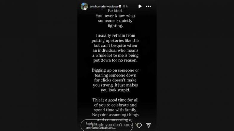 Anshumat Srivastava took to his Instagram stories to express his disapproval of the vitriolic comments being directed at Akriti Negi. Without directly confirming or denying the breakup rumours, he strongly condemned the act of “tearing someone down” based on speculation or perceived relationship issues. His message underscored the personal toll such online harassment can take on individuals.