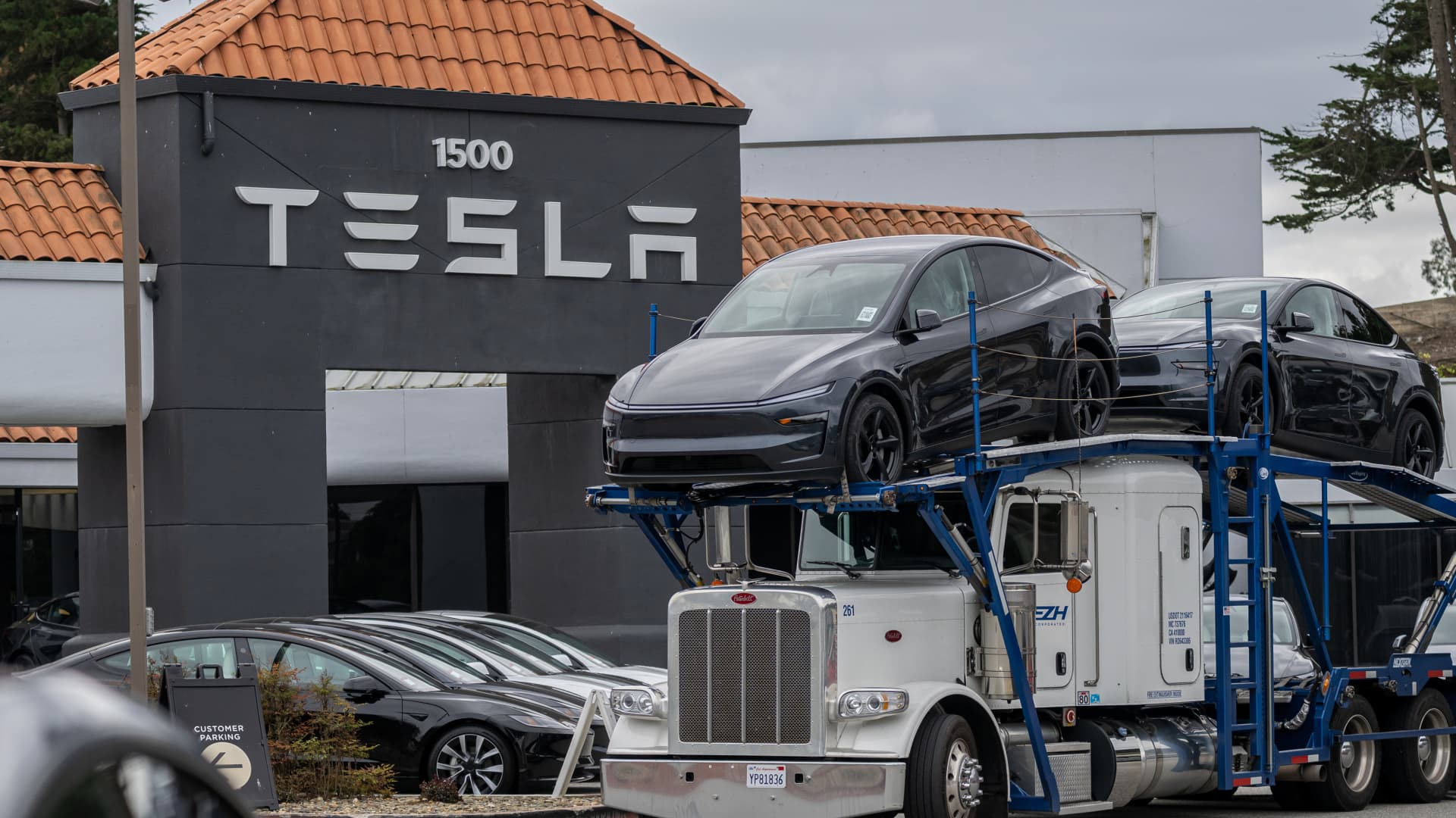 A vehicle transport truck arrives with Tesla Model Y vehicles at the company’s store in Colma, California, US, on Thursday, Oct. 9, 2025.