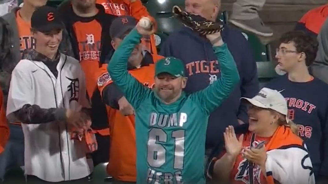 Jameson Turner tells The National about the moment he caught Seattle Mariners catcher Cal Raleigh’s 61st home run of the season while wearing a shirt that said ‘Dump 61 here.’