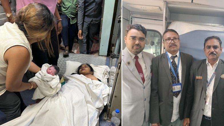 In a remarkable act of compassion and quick thinking, the ticket-checking team aboard the LTT-Prayagraj Duronto Express, along with the assistance of a fellow passenger, facilitated the successful delivery of a baby on board. Central Railway shared a picture on X, capturing the officer cradling the newborn while the mother rested on the train just after delivery. The post praised the dedication and coordinated efforts of ticket-checking staff Mr Nand Bihari Meena, Mr Alok Sharma, Mr Rajkaran Yadav, and Mr Indra Kumar Meena for ensuring the safety of both mother and child amidst the unexpected situation onboard the train. Baby Delivered in Mumbai Local Video: Pregnant Woman Gives Birth On Local Train With Elderly Lady’s Help.