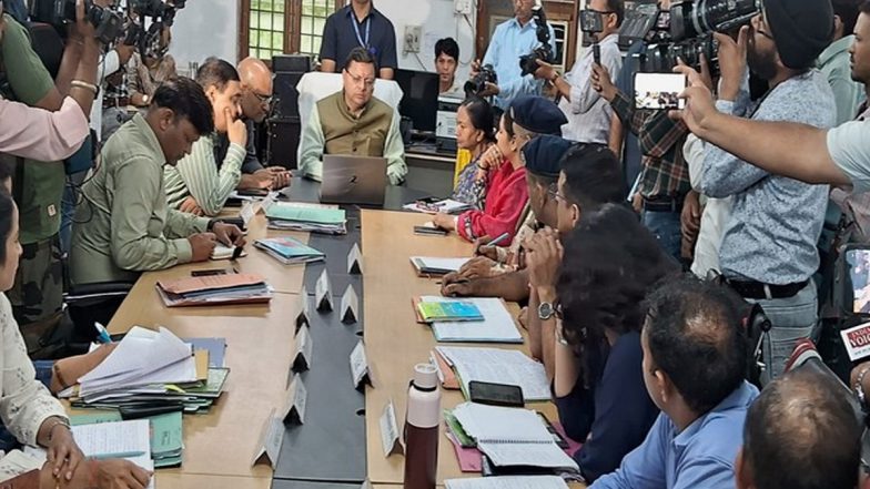 Dehradun, August 9: Uttarakhand Chief Minister Pushkar Singh Dhami assessed the heavy rain situation from the Disaster Control Room at the Secretariat here, officials said on Wednesday. Heavy rains have caused widespread damage in the Uttarakhand. The incessant rains have caused significant damage in many areas, including Rudraprayag, Pauri Garhwal, and Nainital districts, where bridges and roads have been washed away. Uttarakhand Rains: Portion of Gairsain-Karnprayag National Highway Washed Away in Chamoli Amid Heavy Rainfall, People Stranded on Both Sides of Road (Watch Video).