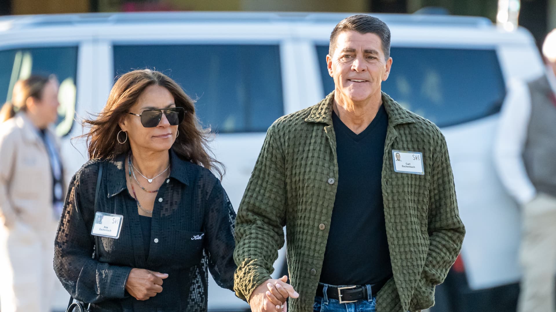 Workday CEO Carl Eschenbach, right, walks to the morning session during the Allen & Co. Media and Technology Conference in Sun Valley, Idaho, on July 11, 2025.