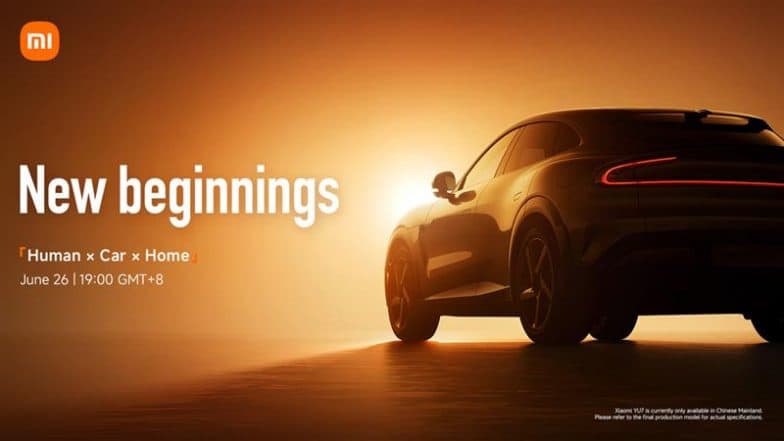Xiaomi will launch its new electric vehicle (EV), the YU7, on June 26, 2025. The upcoming Xiaomi YU7 model may be available in three colours, which will likely be Emerald Green, Titanium Silver, and Lava Orange. Xiaomi is expected to include a HyperVision Panoramic Display in the YU7 to offer an advanced driving experience. A 6.68-inch touch control screen may also be part of the vehicle. The Xiaomi YU7 could be powered by the Xiaomi HyperEngine V6s Plus and may also feature the Snapdragon 8 Gen 3 chip for its cockpit for quick boot-up and over-the-air updates in around 15 minutes. As per reports, the EV may drive in three powertrain options, which is said to include YU7 RWD, YU7 Pro AWD, and YU7 Max AWD. Robotaxi Launched: Elon Musk’s Tesla Launches Driverless Car Service in Austin for USD 4.20, Invited Users Share First Ride Experience (Watch Videos).